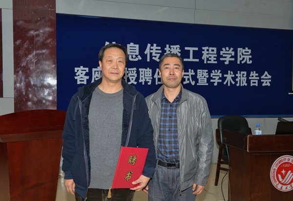在聘任仪式上,宫春洁介绍了毕见文的基本情况。学院院长王立君宣读聘书后为毕见文颁发聘书并发表讲话,希望他在信息传播工程学院这个年轻而有活力的学院中充分发挥作用,体现更大的价值。毕见文在接受聘任的同时也表示,一定不负重托,担当起客座教授的职责,尽心竭力服务学生成长成才和学院专业建设。