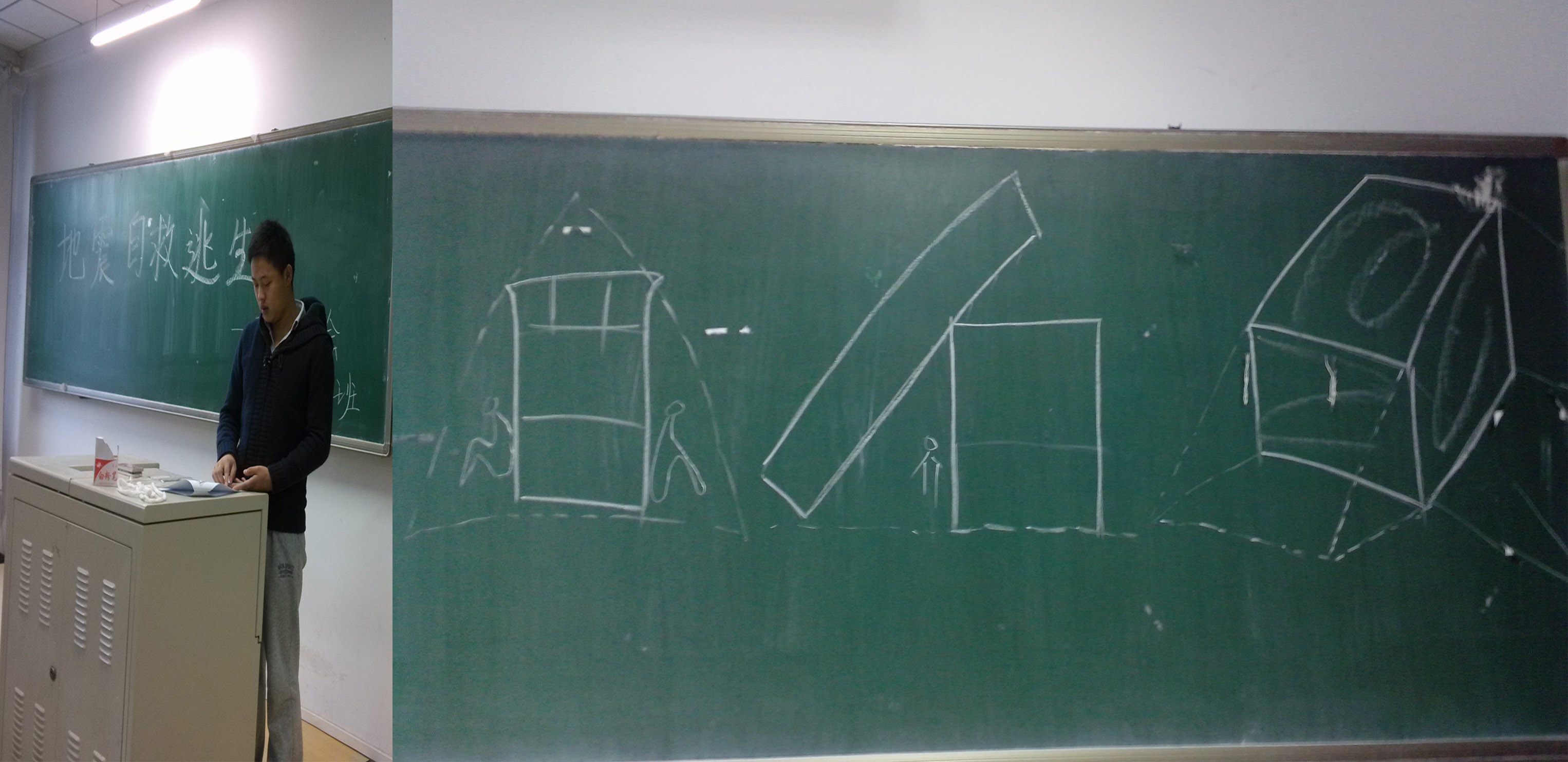 2013年11月26日早自习,121401班在科研楼1201教室成功举办“地震自救逃生”主题班会。此次班会由班长刘明星主持。班会主要针对近期发生的多次地震进行科学性解释。并将全班同学总结的地震自救逃生知识进行汇总。此次班会打破了以往班会的模式。不做过多形式流程的安排,简明扼要的将地震自救逃生知识进行讲解。