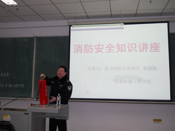 保卫处防火科科长裴国勤主讲,学院全体教师和主要学生干部参加了本次讲座。