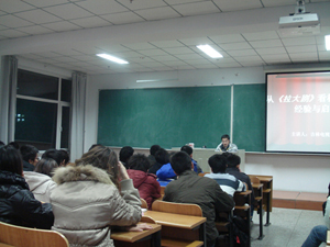 信息传播工程学院团委讯(通讯员 李栋)2009年11月18日晚18时30分,信息传播工程学院在我校南湖校区教学科研楼416举办“从《拉大剧》看栏目制片的经验与启示”广播电视编导专业报告会。本次报告会的主讲人是吉林电视台制片人上官圣。出席本次活动的嘉宾有:信息传播工程学院副院长王立君老师,团委书记郭志伟老师,广播电视编导专业教研室主任宫春洁老师,孔庆东老师。