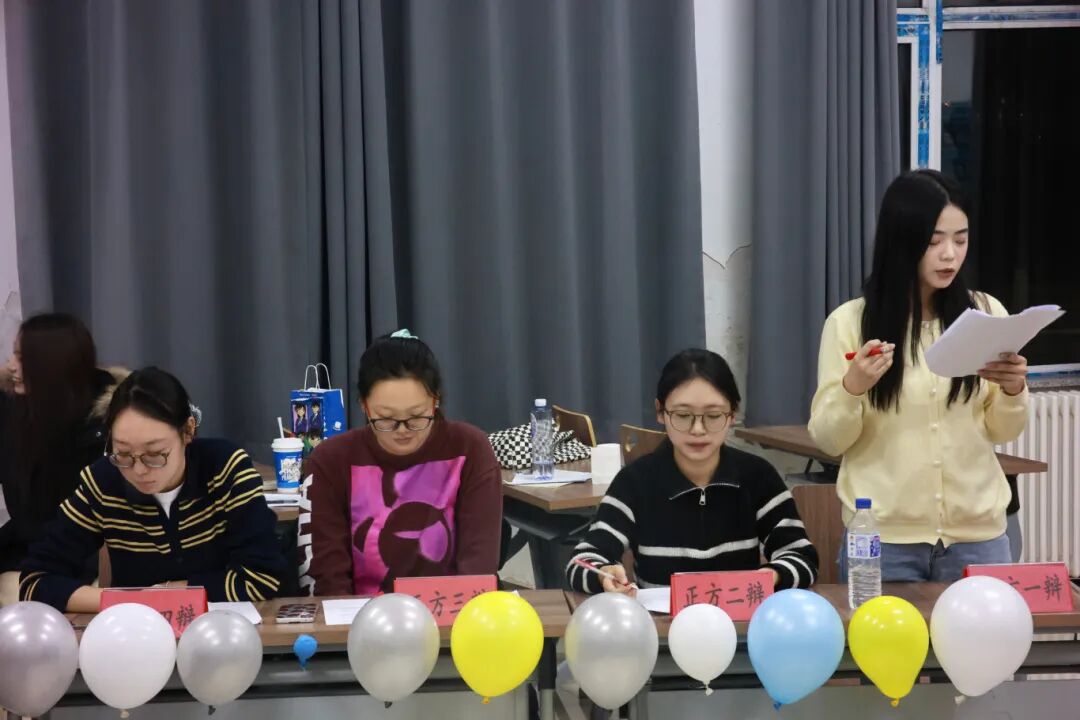 本场辩论赛主持人为陈彦青,评委团由学院研究生会执行主席宋宝堂,轮值主席刘忠豪,权益部负责人李想,生活部负责人赵书慧,202413班班长刘千赫组成。